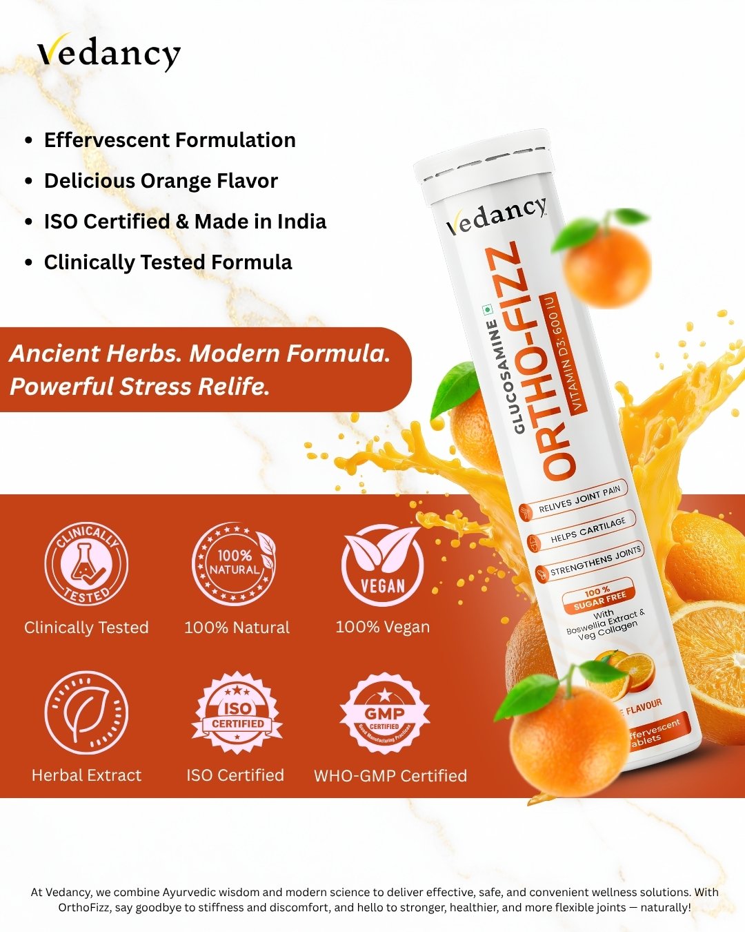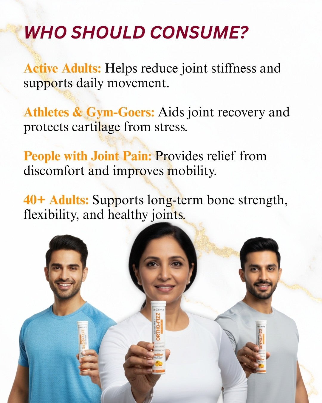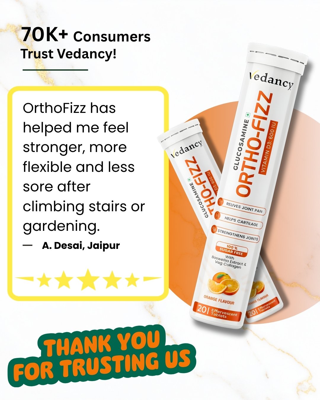 Experience the power of science and nature in every fizzy sip with Vedancy OrthoFizz Effervescent Tablets – a complete joint care formula crafted to support healthy cartilage, flexible joints, and strong bones. Whether you are an active professional, athlete, or senior adult, OrthoFizz helps keep you moving with comfort and confidence.