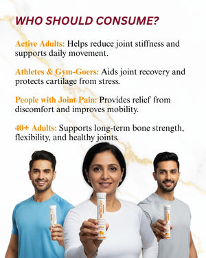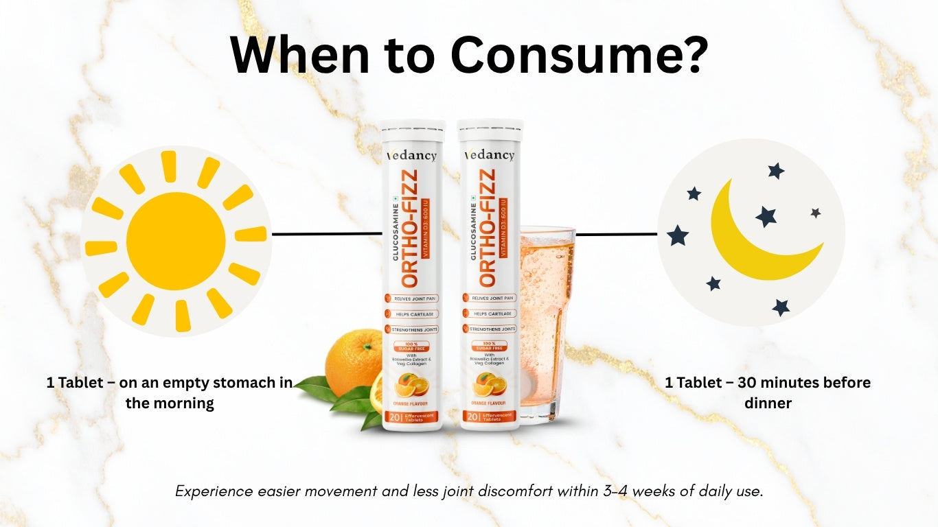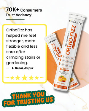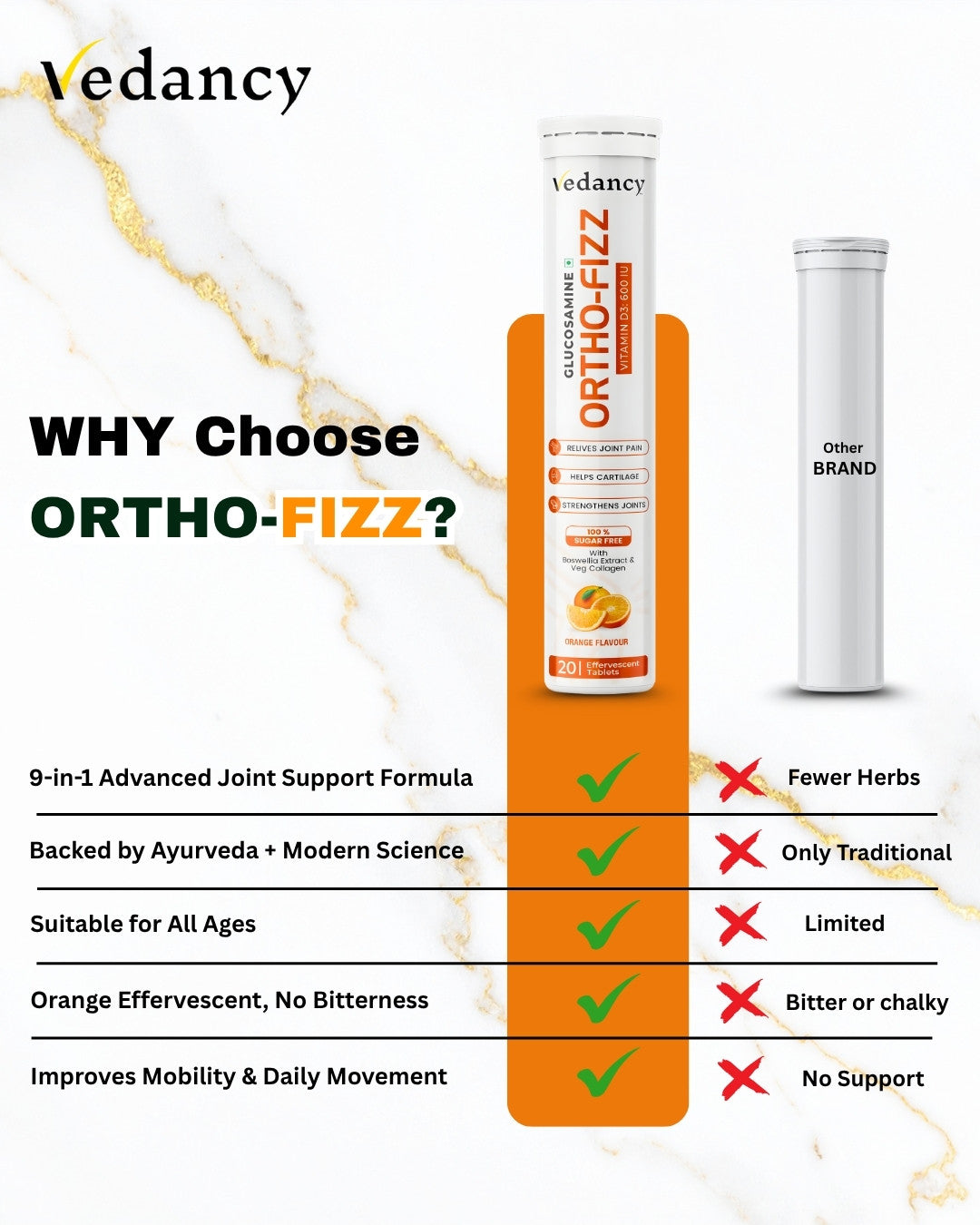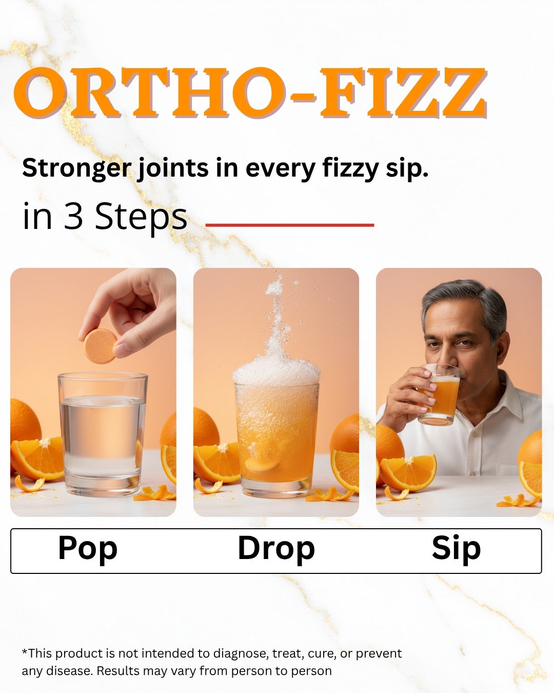 Experience the power of science and nature in every fizzy sip with Vedancy OrthoFizz Effervescent Tablets – a complete joint care formula crafted to support healthy cartilage, flexible joints, and strong bones. Whether you are an active professional, athlete, or senior adult, OrthoFizz helps keep you moving with comfort and confidence.