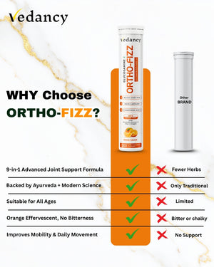 Vedancy OrthoFizz is developed using clinically proven and time-tested ingredients that are gentle on the stomach and rapidly absorbed through effervescent technology — giving faster relief and higher bioavailability compared to traditional tablets or capsules.