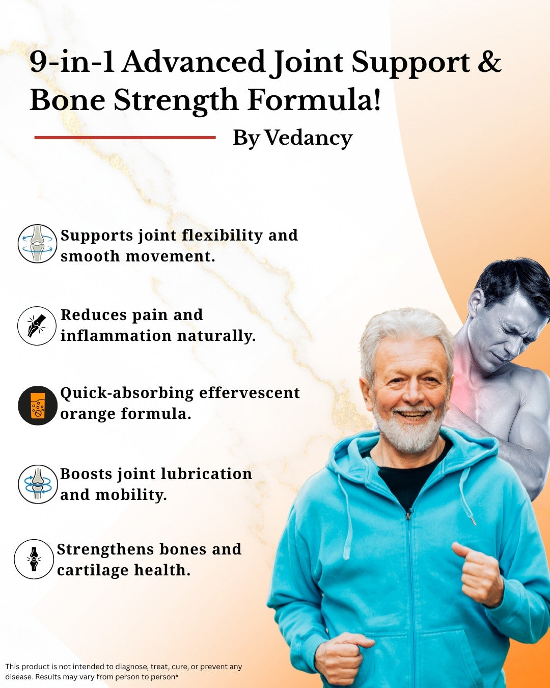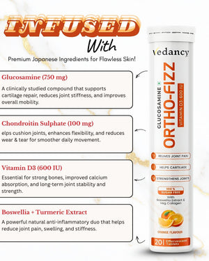 Vedancy OrthoFizz Effervescent Tablets for Joint Pain Relief | Glucosamine 750mg, Chondroitin, Vitamin D3, Veg Collagen, Boswellia & Turmeric Extract | Strengthens Bones, Improves Mobility & Flexibility | Orange Flavor | Sugar-Free